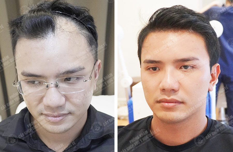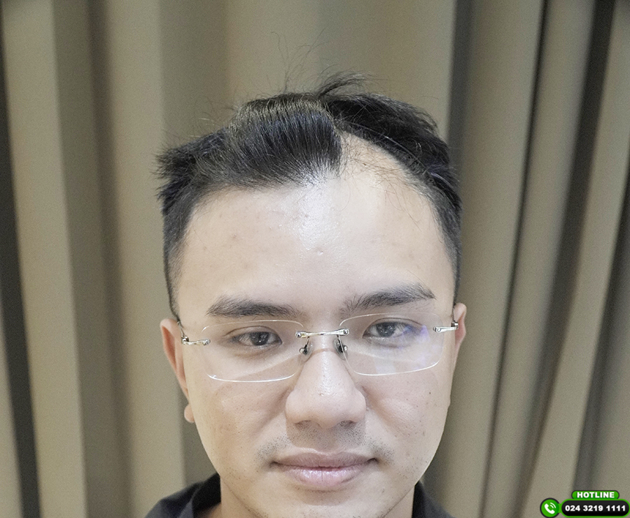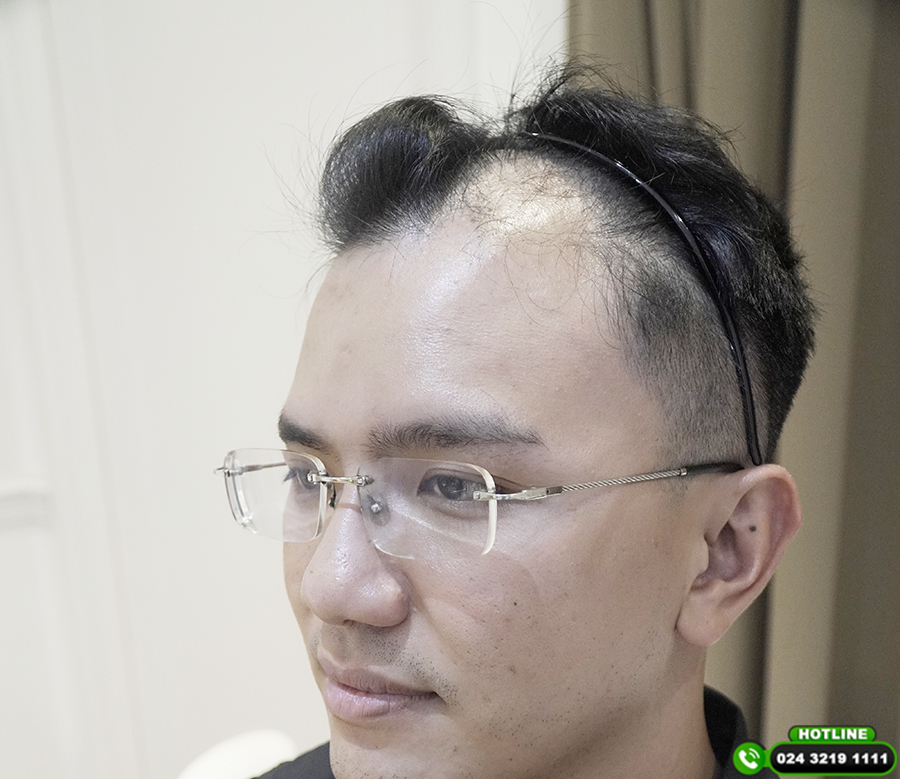 Anh Tuấn (35 tuổi) bị hói lệch bên phải kéo dài nhiều năm, vùng da đầu đã trơn và không còn nang tóc hoạt động. Sau khi thực hiện cấy tóc tự thân, vùng hói đã được che phủ bằng lớp tóc dày khỏe, đường chân tóc liền mạch, cân đối và có thể thoải mái vuốt tóc, tạo kiểu.