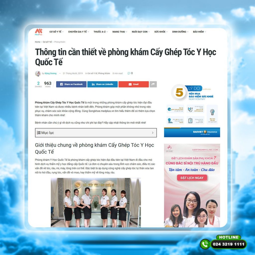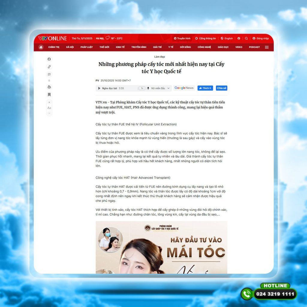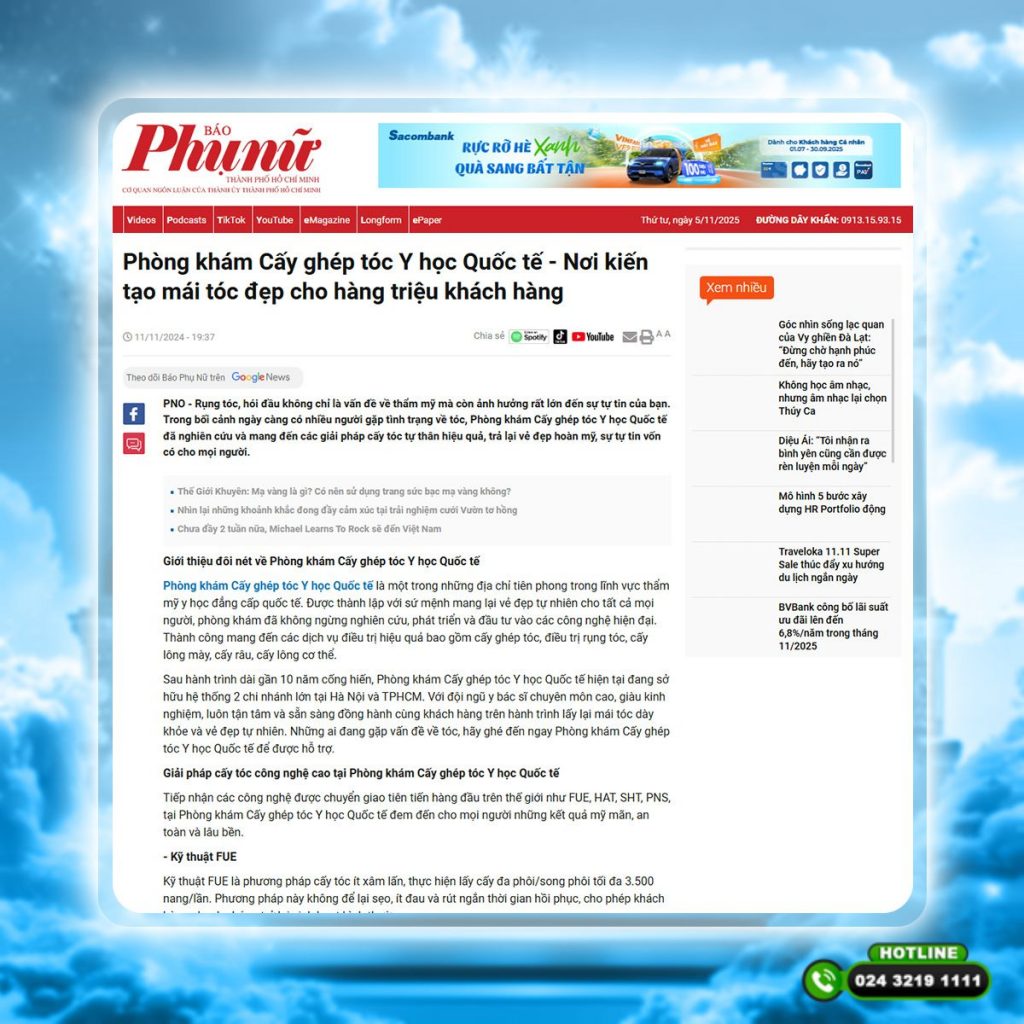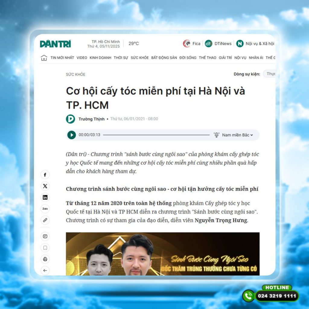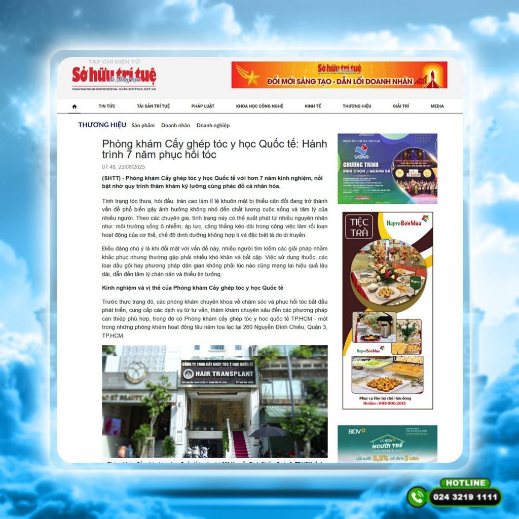 Không chỉ cung cấp dịch vụ chuẩn quốc tế, Phòng khám Cấy ghép tóc Y học Quốc tế còn ghi dấu mạnh mẽ trên bản đồ truyền thông Việt Nam. Hình ảnh và các bài viết về phòng khám liên tục xuất hiện trên VnExpress, VTV Online, Dân trí, 24h, Dân Việt, cùng nhiều nền tảng số khác góp phần nâng cao nhận diện thương hiệu và củng cố niềm tin khách hàng.