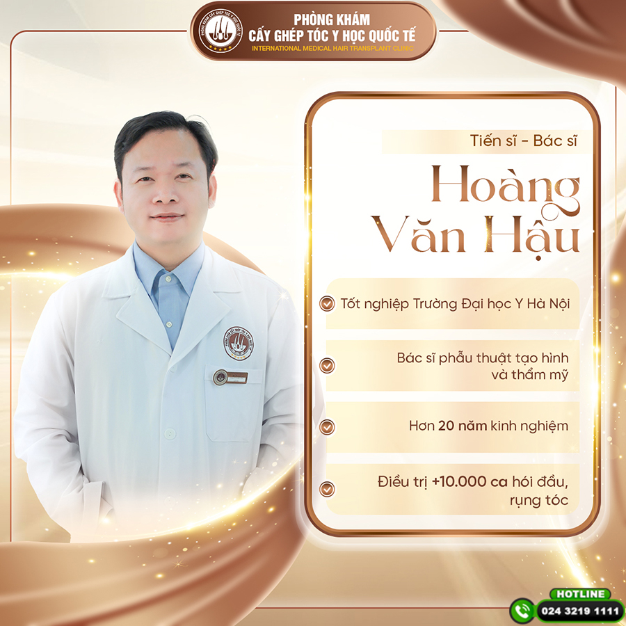 Tiến sĩ Hoàng Văn Hậu là bác sĩ đa khoa, sở hữu bằng Tiến sĩ – Thạc sĩ Y khoa cùng chứng chỉ hành nghề Ngoại khoa và Phẫu thuật tạo hình thẩm mỹ. Với nền tảng đào tạo bài bản tại Đại học Y Hà Nội và kinh nghiệm thực tiễn phong phú, bác sĩ xây dựng phác đồ cấy tóc dựa trên phân tích kỹ lưỡng nguyên nhân rụng tóc và tình trạng da đầu của từng khách hàng.