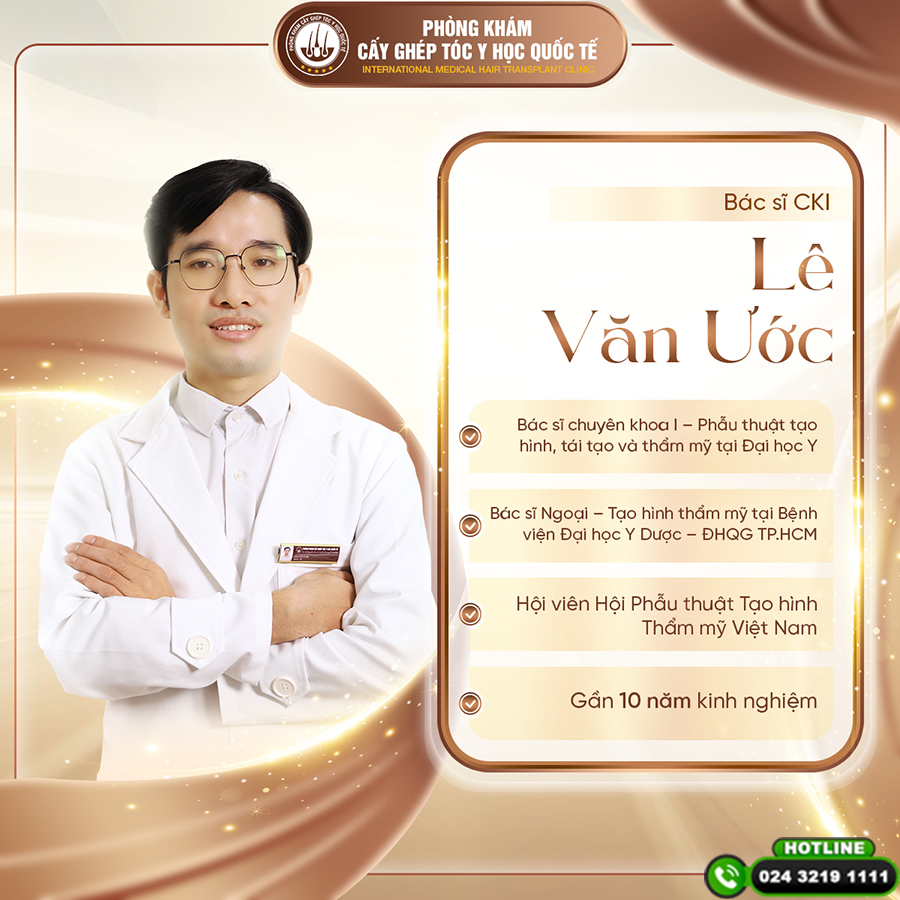 Tốt nghiệp Đại học Y Dược TP.HCM và từng công tác tại Bệnh viện Đại học Y Dược – ĐHQG TP.HCM, BS CKI Lê Văn Ước sở hữu nền tảng chuyên môn vững chắc cùng phong cách làm việc cẩn trọng, nhẹ nhàng. Bác sĩ đặc biệt am hiểu cấu trúc gương mặt và các tiêu chuẩn thẩm mỹ hiện đại. Từ đó thiết kế đường chân tóc tự nhiên, trẻ trung và phù hợp với từng cá nhân.