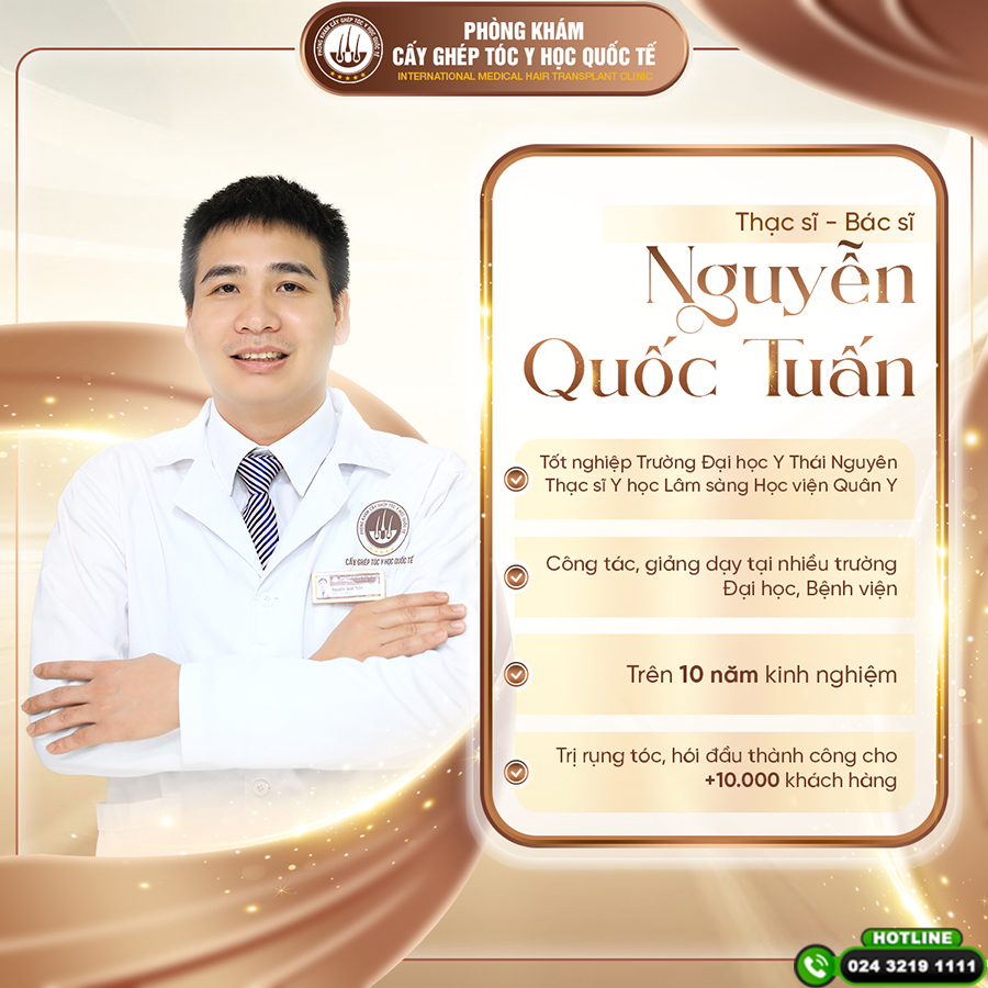 ThS. BS Nguyễn Quốc Tuấn là người có phong cách làm nghề tỉ mỉ, chuẩn xác và đặt yếu tố y khoa lên hàng đầu. Bác sĩ có thế mạnh nổi bật ở khâu thăm khám chuyên sâu, chẩn đoán đúng nguyên nhân rụng tóc và thiết kế đường chân tóc theo tỷ lệ hài hòa với khuôn mặt, độ tuổi.